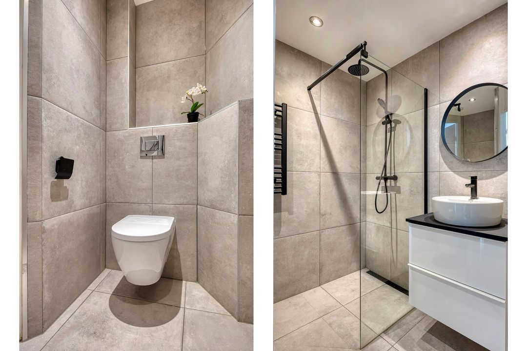De badkamer is modern uitgevoerd en is voorzien van een toilet, wastafelmeubel en douche.